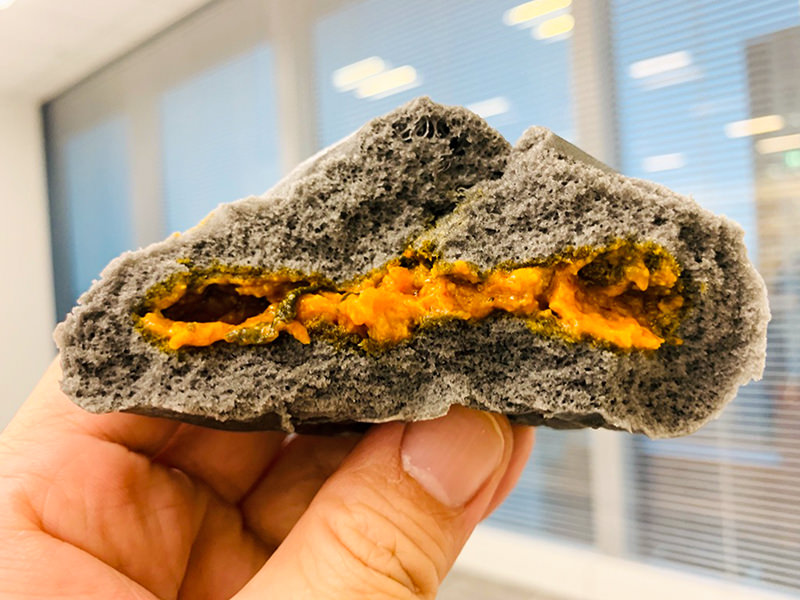 いかがだろうか。このインパクトの強さ。生地には竹炭が練り込まれているという。なぜか。