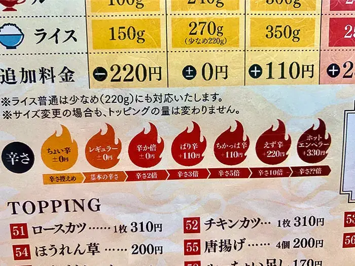 「ちょい辛」「レギュラー」「辛か倍」までは無料。その後の「ばり辛」「ちかっぱ辛」はプラス110円。レギュラーの10倍の辛さになる「えず辛」はプラス220円だ。ちなみに「えずい」は、「怖い」という意味の博多弁である。そして、最後に構えるのがホットエンペラー(プラス330円)だ🔥