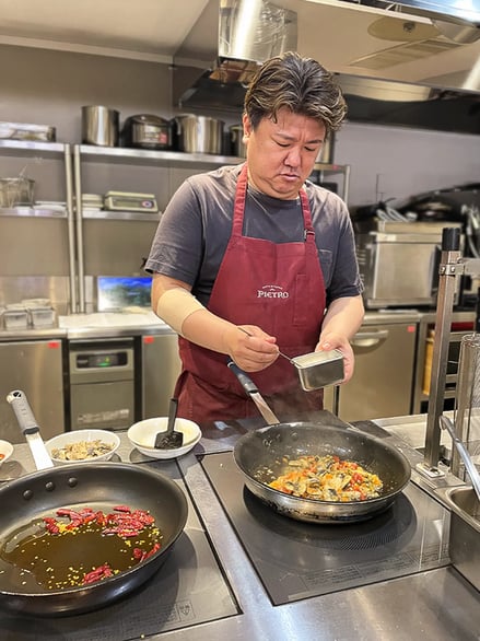 挨拶してくれたのは今回のメニューを開発したピエトロの栄田シェフ。赤いエプロンとフライパンが似合う、料理人オーラ漂う人物だ。