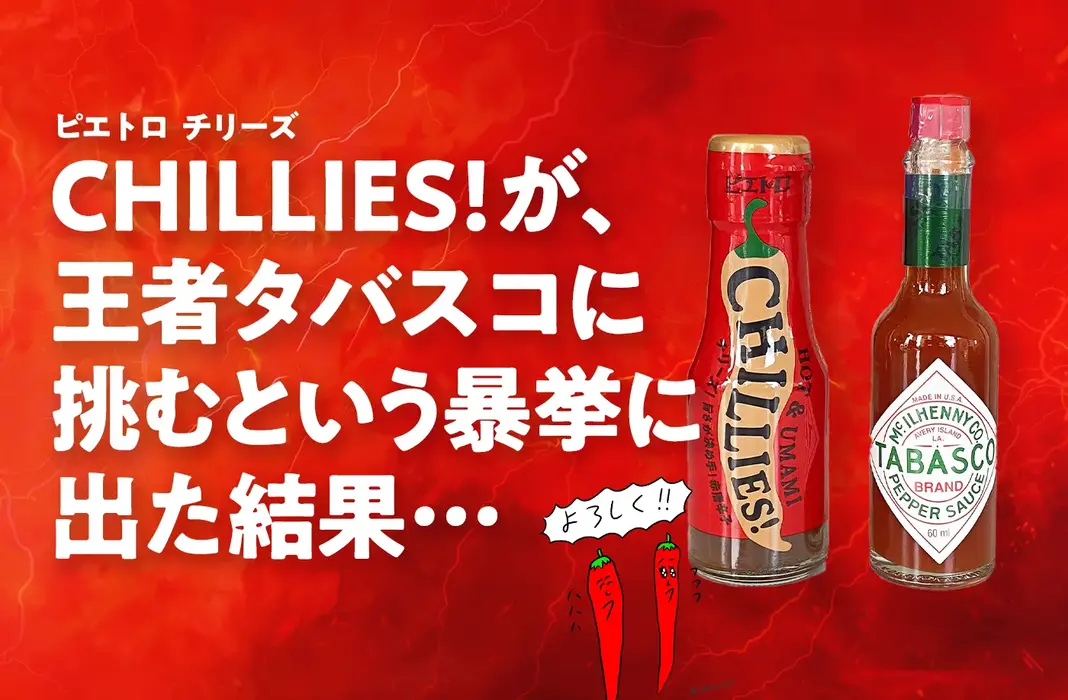 「辛い調味料」と聞いて誰もが1番に浮かべるタバスコ。タバスコは、辛い調味料界における圧倒的王者と言えるでしょう。そんなタバスコ一強時代に、ピエトロが送り込む新参者CHILLIES!(チリーズ)。ドレッシングやパスタで有名な同社が新たに開発したこの辛味調味料は、唐辛子の辛味に昆布茶の旨みをブレンドした「旨辛調味料」。果たしてこれが王者タバスコにどれくらい迫れるのか!?無謀にも1対1のデスマッチを行うという本企画である。