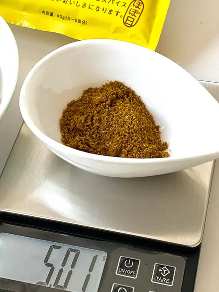 「カレー5〜6皿分に1袋(40g)」と書いてあるので、この分量のポトフにカレーの恩返しを5g入れてみる。5gってまあまあな量ですね。