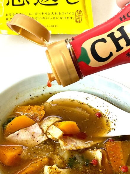ポトフにカレーの恩返しだけでもすごく旨くて好きなんですが、ここにCHILLIES!(チリーズ)を25滴入れる。