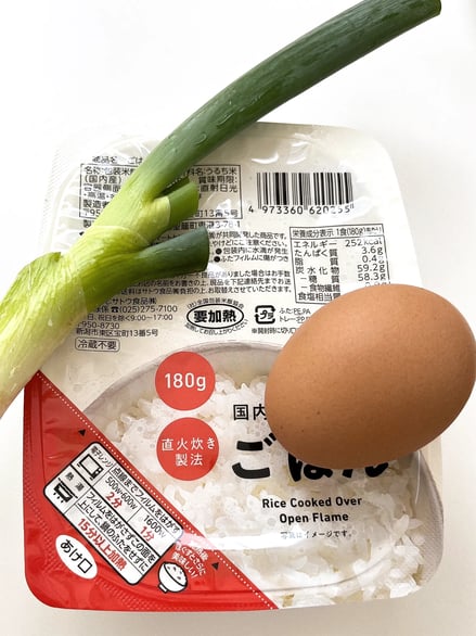 今日は、買い置きのパックご飯、卵、余ったネギという冷蔵庫定番のメンバーです。