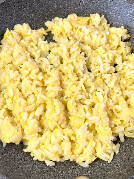 しゃもじやヘラ状のもので、卵の水分をご飯に含ませていくように混ぜるといい感じにほぐれてきます。