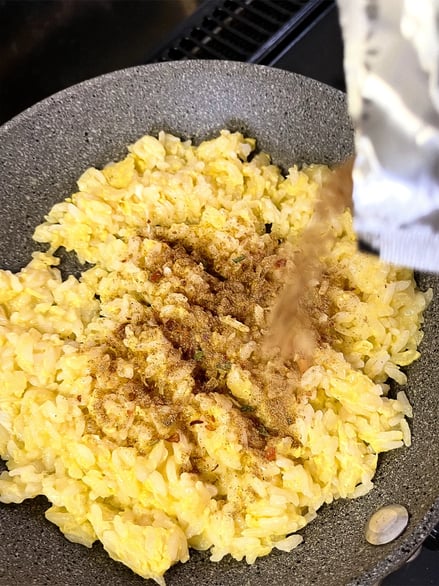 手際よく、炒飯の素を投入してさらに炒め混ぜ~👩🍳