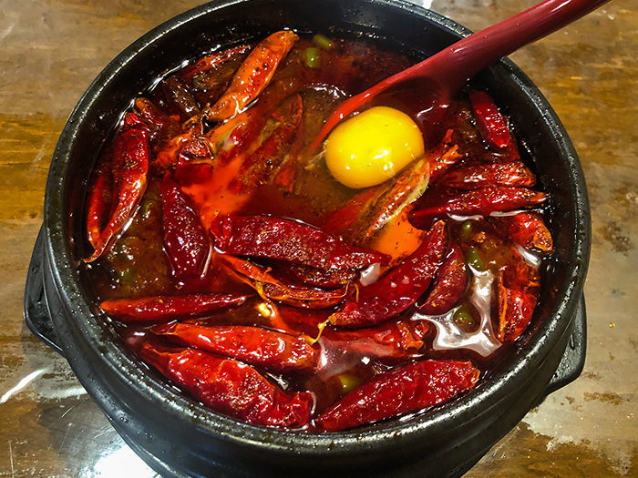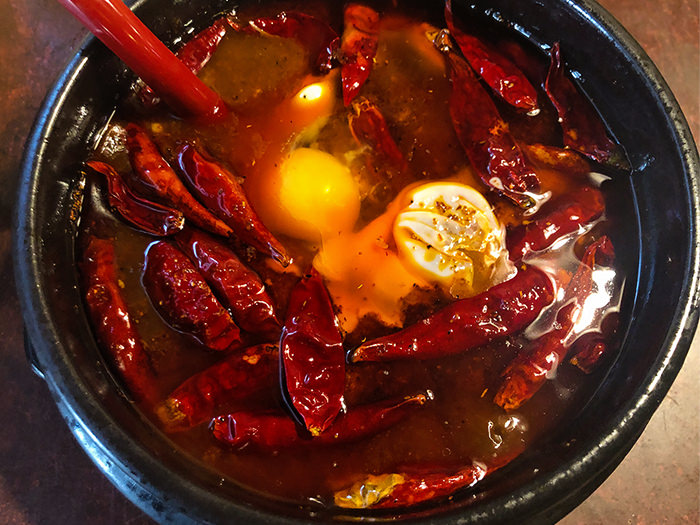 ゴロゴロ入った唐辛子は、一口で舌や唇を痺れさせてきますが、挽肉の旨味と、スープの塩味が食欲をそそり「辛い辛い🥵💦」と思いながらも手が止まりません🥄💥