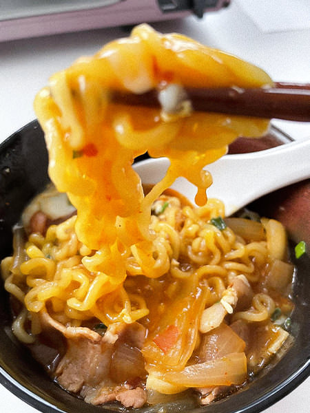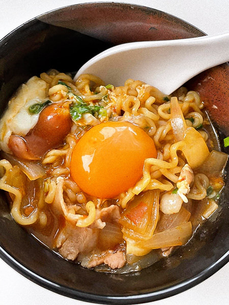 単品でも十分においしい辛ラーメンに、ニンニク・肉・玉ねぎといった旨味の代表格たちが香りと味わいを足しています。はい、もう私の舌が喜び勇んでおります。いまにも踊りだしそうです💃✨そして、麺にからみつくたまごがいい仕事を😋約10分でこんなごちそうが作れるなんて最高っす👍