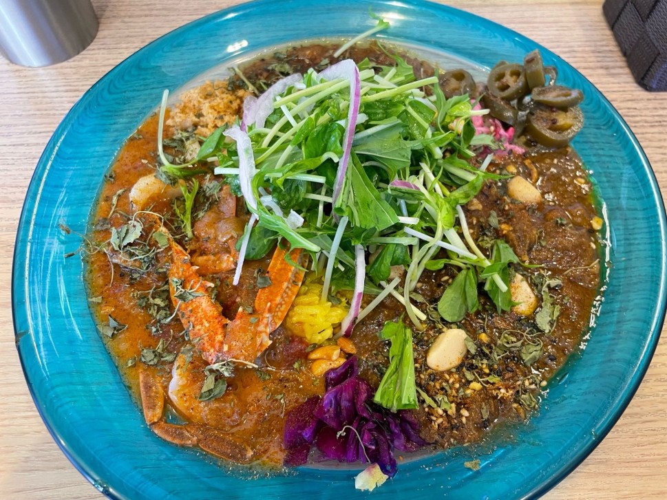 渡り蟹出汁!!海老のスパイスカレー、オリジナルスパイスキーマ、のあいがけ3種にトッピングでハラペーニョアチャールをオーダー。