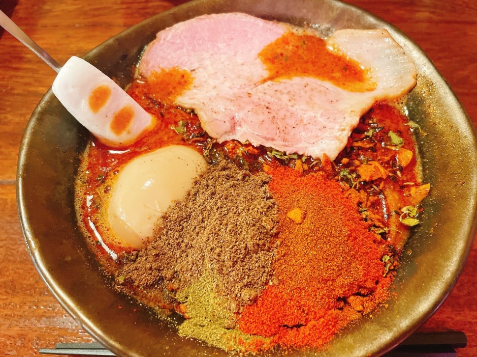 スパイスカレーのような香辛料が入っていて、途中からラーメンじゃなくてカレー食べているような気に笑