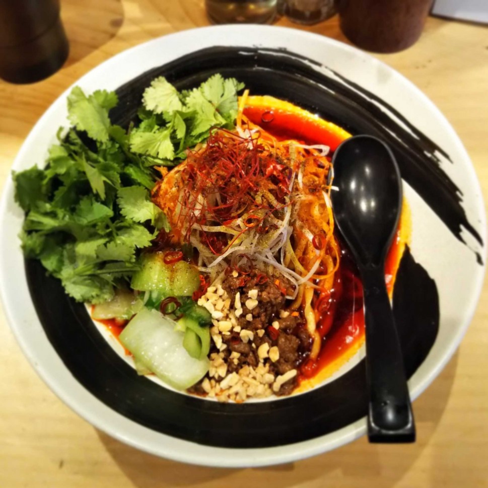 旨味の強い太麺は辛さのなかにも存在感ある風味をだし、肉味噌と油が絶妙のハーモニーを奏でる。