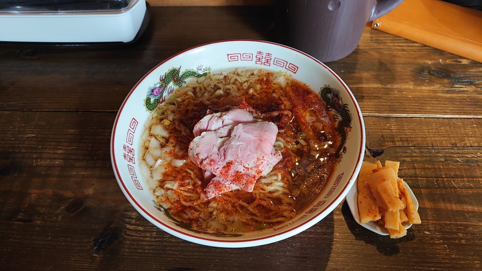 チュウカソバキミイロの新メニュー、「ニンニクジャスティス」を2辛痺れ抜きで頂きました!2.5KM。しっかりした辛さでスープも美味しく飲み干しました!辛さと痺れはそれぞれ5まで選べます。写真のラーメンの横に写ってる「親の仇メンマ」は1.8KMとジャッジしました。