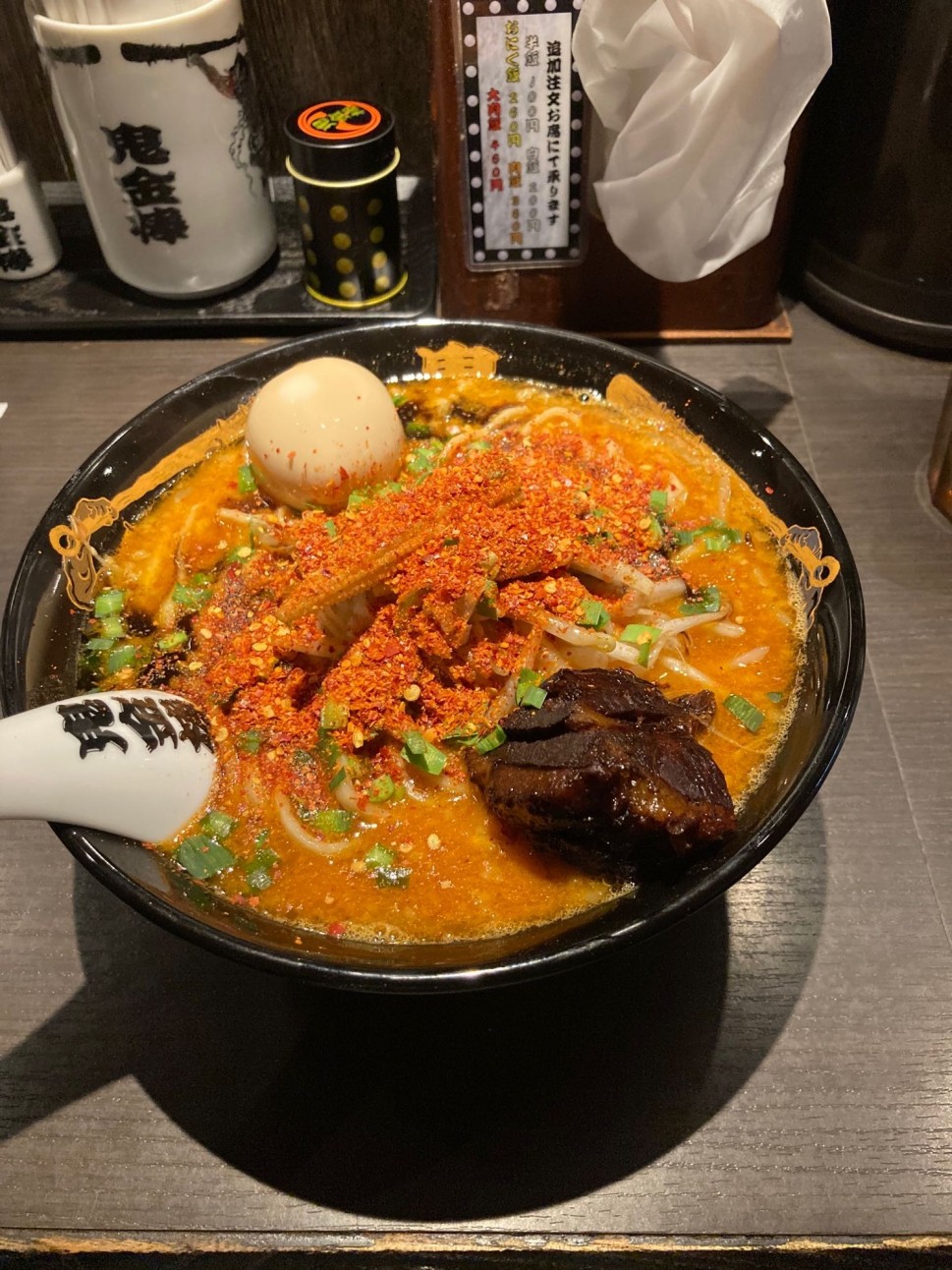 パクチー、味玉ラーメン 辛さ鬼マシ、しびれ普通