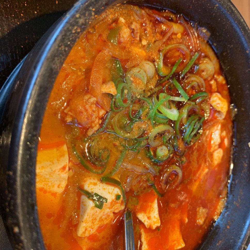 初めて来店。辛さが変えられるみたいだったので辛さMAXを選択。正直チェーン店の辛さだから…と期待していなかったのだが、意外にちゃんと辛かった。スン豆腐は豆腐が中まで熱々だから美味しいよね。