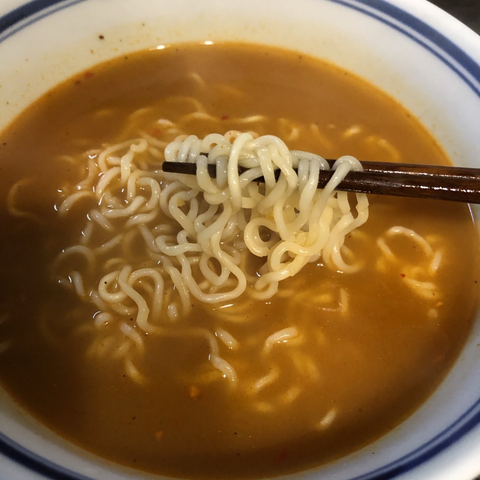 ニンニクが効いたパンチのある香り。すするから余計に辛く感じるのか、ファーストインパクトは3KM超え🔥濃厚なスープ、ひき肉いれて坦々麺風にしてもいいなぁ。