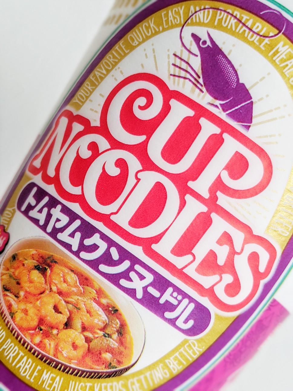 辛さ酸味が効いたトムヤムスープ。濃厚な海老の出汁にレモングラスとパクチーの香りもほどよい、さすが世界のカップヌードルです。