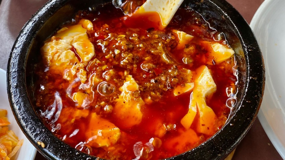 石鍋でグツグツと沸騰した状態でやってきて、食欲をそそりますね〜😆