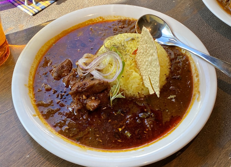 フレッシュで粒子の荒いスパイスが、初めはそれぞれ主張してきてそれが楽しく、食べてるウチにハーモニーをなす。すごく美味い!!