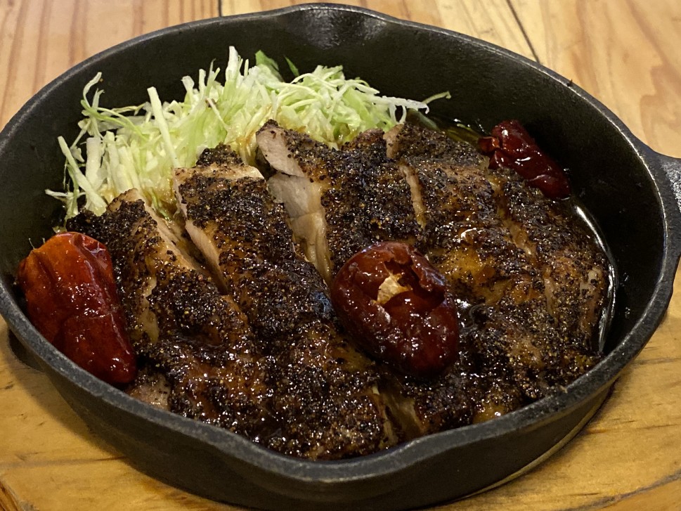 トンテキではなくてトリテキ。黒胡椒をこれでもかと言うほど振り掛けて香ばしく焼き上げる荒業。胡椒の辛さと香りが鶏の旨味を引き立てる。
