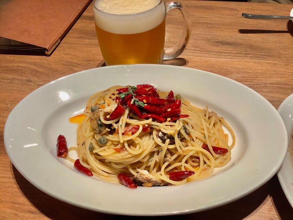 悶絶は唐辛子15本使用で辛味オイルで仕上げているのですが、一口目はややピリ辛のとてもおいしいペペロンチーノ✨ビールが進む進む🍺☺️唐辛子がしっかり辛くてそれを食べるごとにヒリヒリする感じです。結局2点台後半で着地。とてもおいしい。9月末までです!皆さん、急げ!!!笑