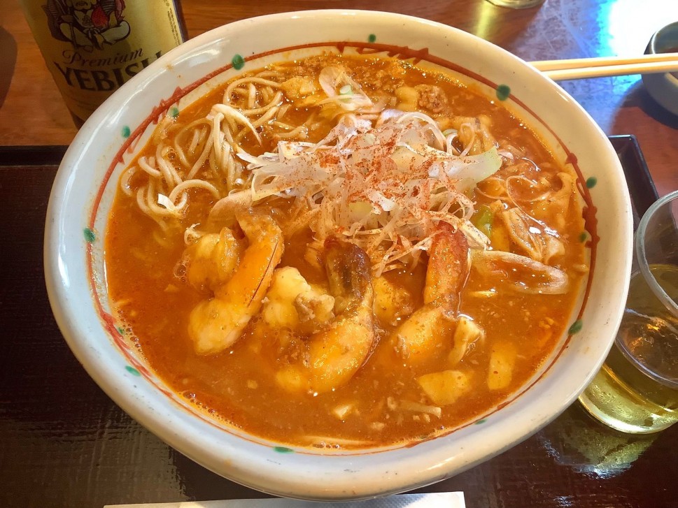 使用している唐辛子や辛味成分はそんなに控えめじゃないと思うのですが、蕎麦の旨さ、海老の旨さ、モツの旨さがあって非常に旨さを感じる食べやすい辛さになっています。実際、カップ麺の蒙古タンメンといい勝負の辛さですが、満足度は十分。一味の追い辛もできる仕様なので、辛さが足りなければ自分でカスタマイズ出来ます。とりあえず、ビールに合い過ぎで、ビールが止まらないです(ヱビス)。麺少なめだと、戦いをせずにビールも飲めるはずです☺️ご馳走様でした。1800円越えとちょっと割高ですが、観光地なので許容範囲だと思います!