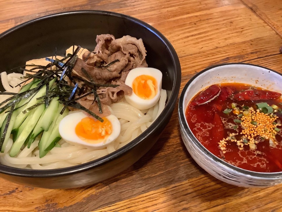 つけ麺ですがうどんです。うどんの甘さはありますが、つけ汁の麻辣汁は結構なヒリヒリ。かき混ぜるとひき肉と一緒に沢山の花椒が。ビリリともします。たっぷりつけ汁につけなければ、辛さのコントロールは出来ます☺️