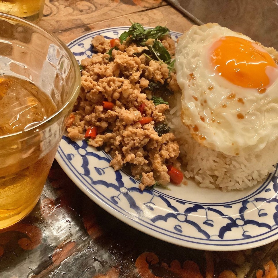 辛おいしい\\٩( '辛' )و //いやー、感動するレベルですね。ゲキカラドウ2で登場する激辛ver.をオーダーできました。ピッキーヌの突き抜けるも爽やかな辛さに汗をかきながら、それでも蓄積は控えめ。なので、辛い(からい)のに辛く(つらく)ないのがとても良いです!メコンというタイのラム酒🥃をロックで飲んで、仕上がった感じでした。ガパオもおいしいけど、米だけで飲めるレベルにおいしい。うまー。