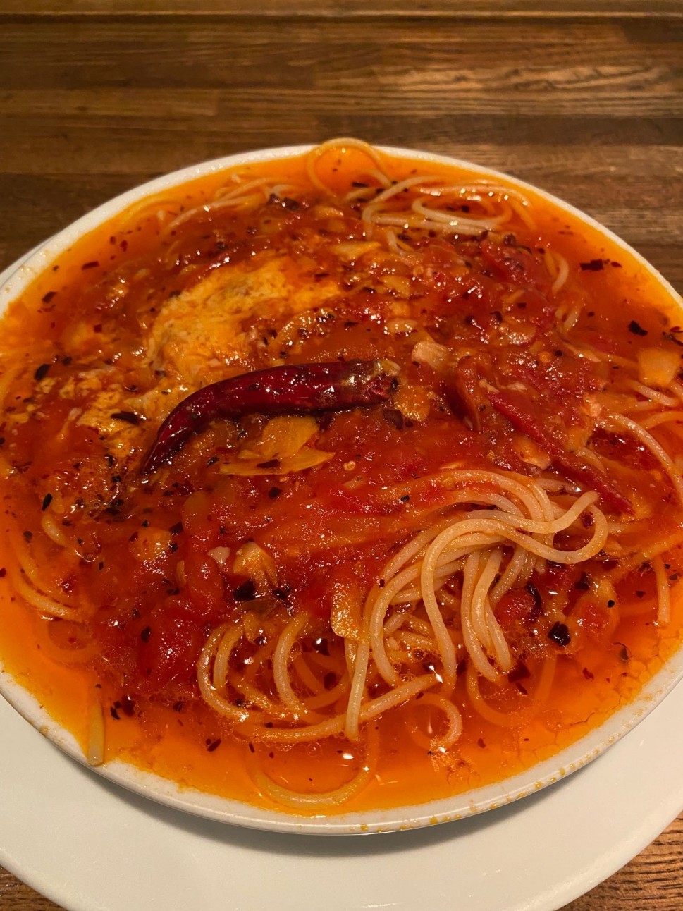 ◎しっかりニンニクの効いたトマトベースのアラビアータ風スープスパゲッティ