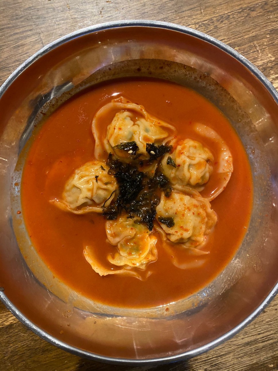 韓国の伝統家庭料理マンドゥです。日本の餃子に近いです。ご注文の際には具材もスープも規格外の辛さに付き注意が必要です。