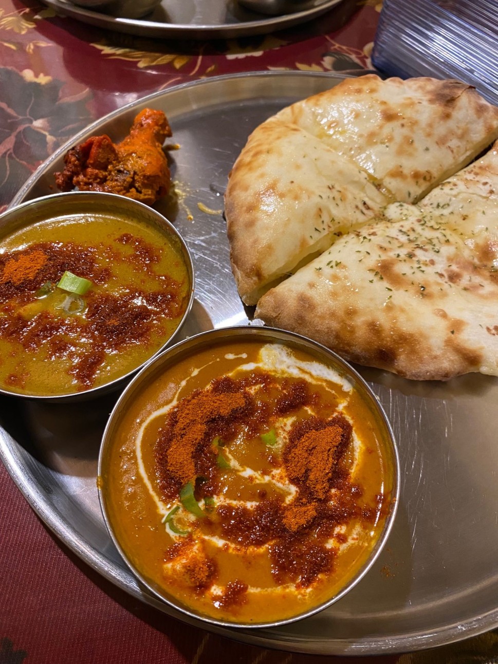 チキンカレー、タマゴカレー、チーズナン、タンドリーチキンのセット。