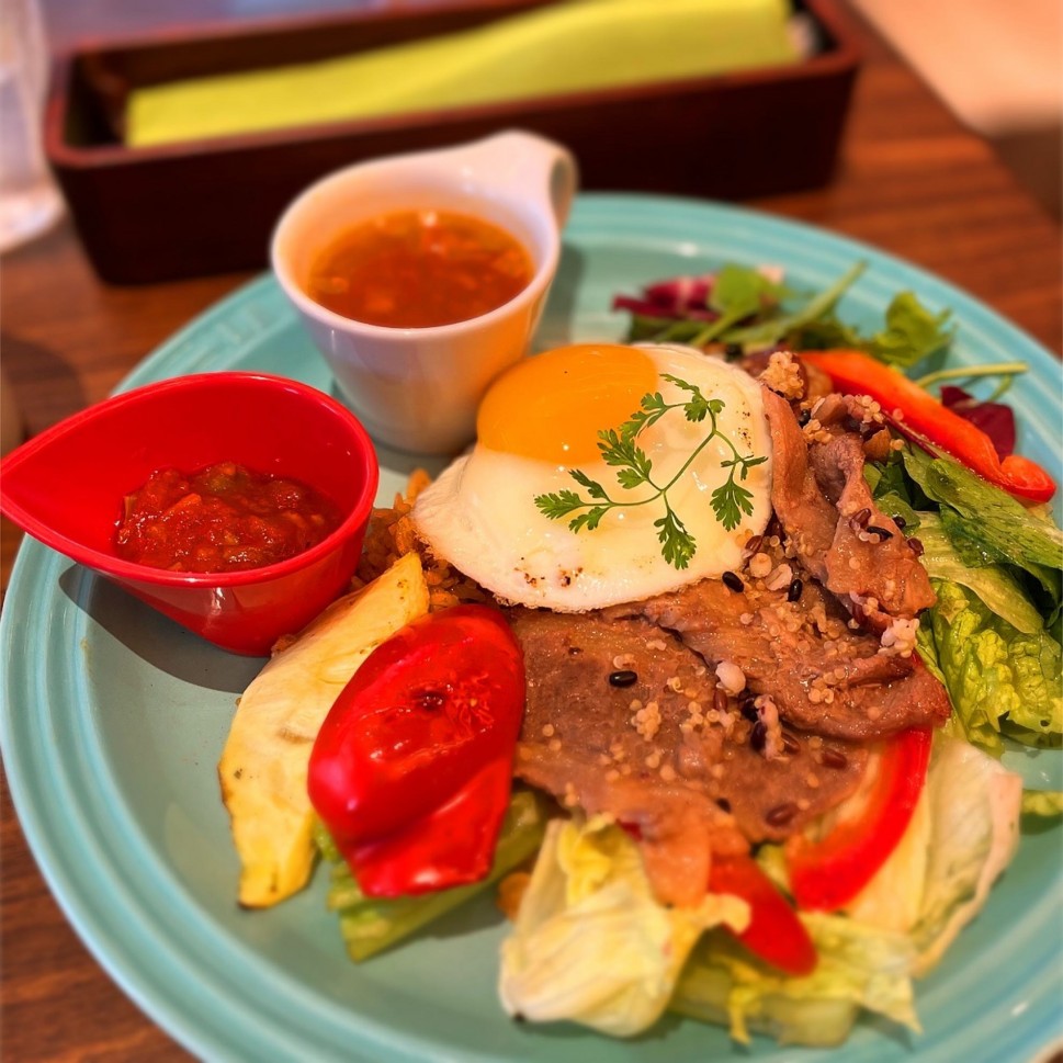マイ辛には至りませんでしたが、ケイジャンピラフが思っていたよりスパイシーで、甘辛照り焼きやサルサソースと相まって、夏のテラス席でキンキンに冷えたビール🍺と合うだろな〜という美味しさです。