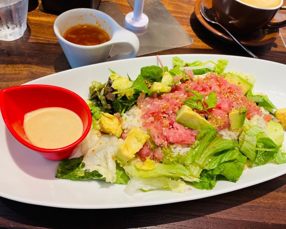 キヌアや発芽玄米が混ざっているごはんの上にまぐろとアボカド、野菜。そこに別添えのソースをかけていただきますが、このソース、わさびがピリリと効いていて美味しい♪