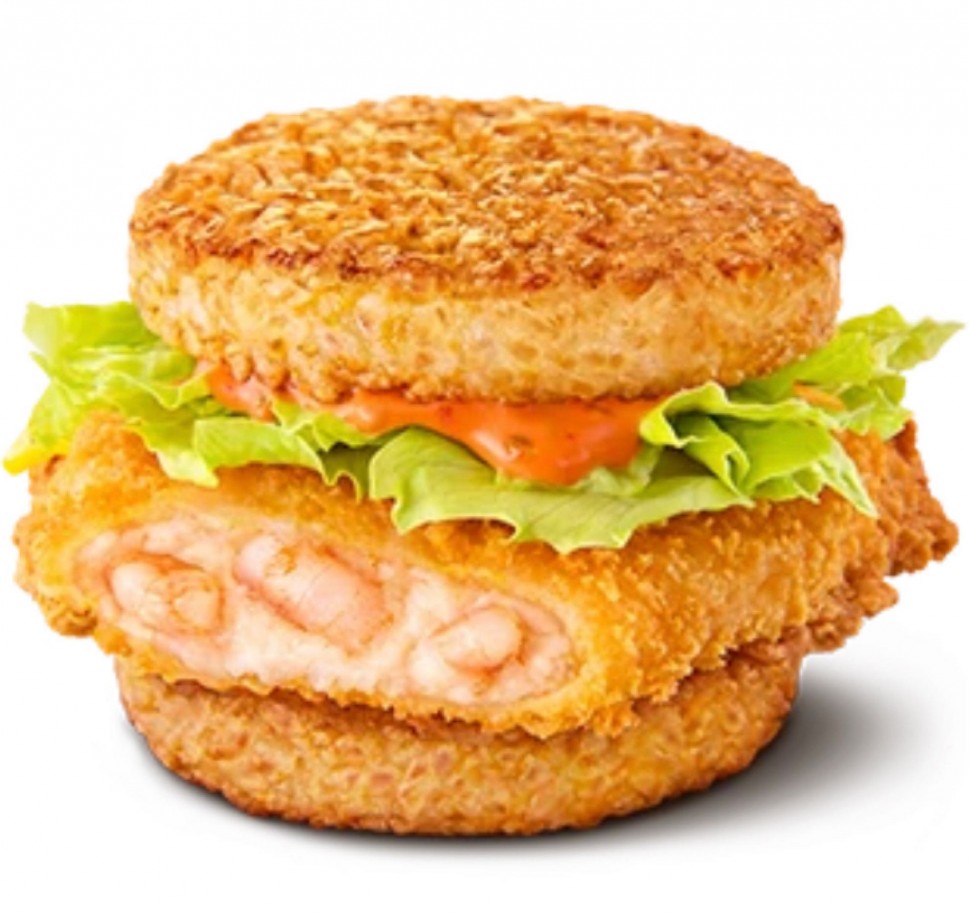 ごはんバーガーシリーズに新登場の海老。このソース、多分スパチキやスパビーと同じソースだと思われます。