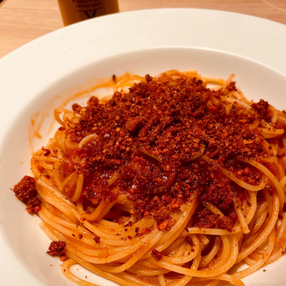 トマトの酸味と、上にふりかけてあるフライド唐辛子andガーリックみたいな食感が楽しく、旨辛です。