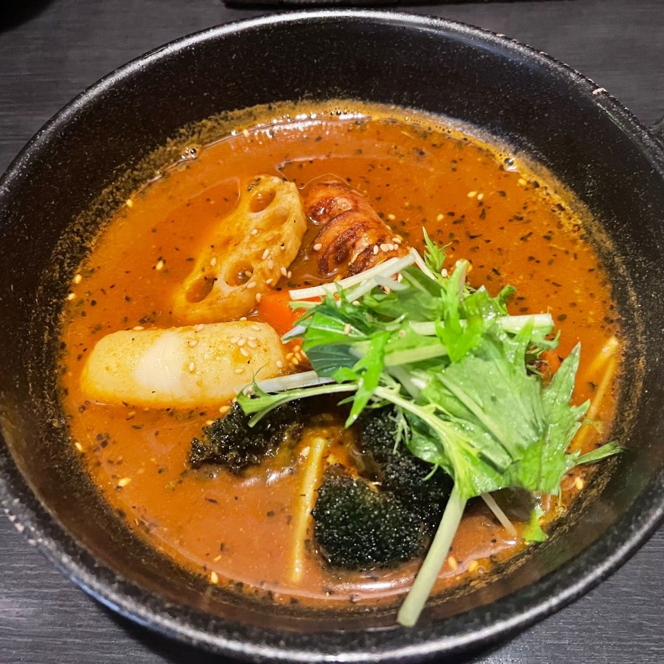気になってたスープカレー。6辛まであったけど今回は5辛。私にちょうどいい辛さでした!下がヒリヒリするけどめっちゃ美味しいと感じられる絶品。野菜とフランクがごろっとはいってて結構ボリューミーだしトッピングもあって充実してました!