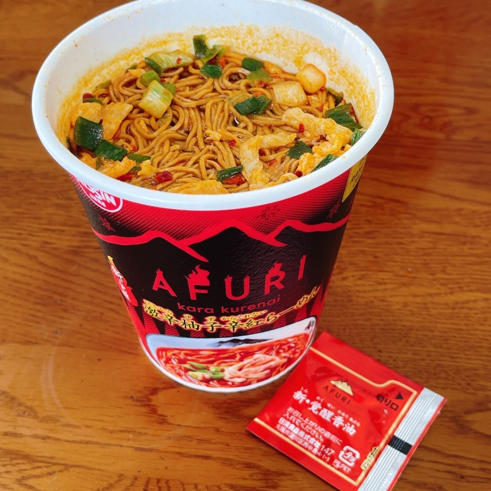今日のランチは新発売の日清カップ麺、1000食限定先行発売のAFURI新・覚醒激辛柚子辛紅らーめんをゲット!真っ赤なスープはほのかに柚子の香りかします。新・覚醒香油を投入すると辛さレベルアップしますが思ったほど辛く感じませんでした。山椒が練り込まれた細麺はサクサクした歯応え、スープも美味しくいただきました。