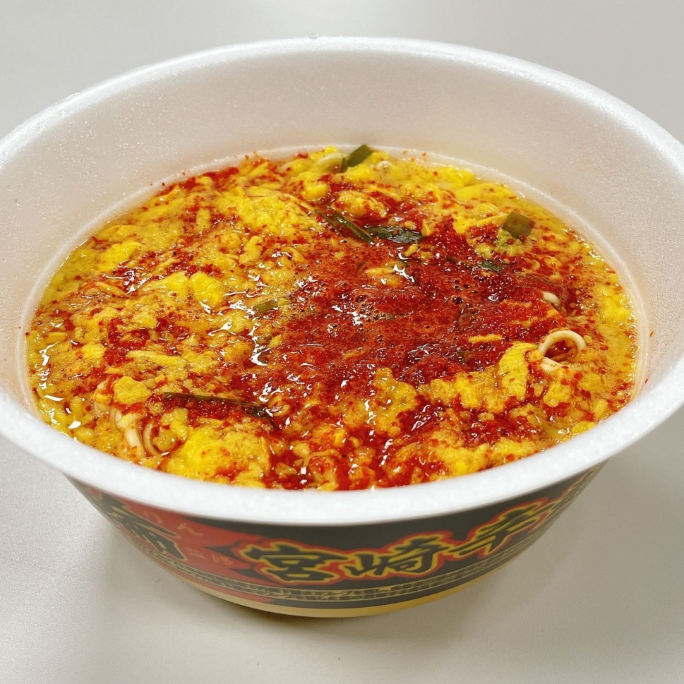 ランチは明星カップ麺、辛麺屋輪の宮崎辛麺です。唐辛子粉がたっぷり入っていますが辛さは意外にマイルドでした。玉子やニラが宮崎辛麺の特徴をバッチリ再現しています。
