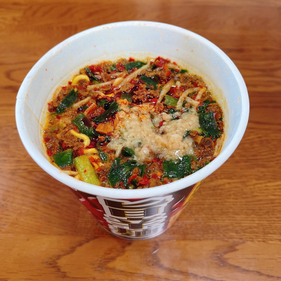 ランチはエースコックカップ麺の来来亭旨辛麺です。デフォルトで結構な辛さです。麺のクオリティがいまいちだけど、たっぷりのニラと別添えの背脂でスープの再現性はなかなかです。ジョロキア追加してMAXENDにして美味しく頂きました!