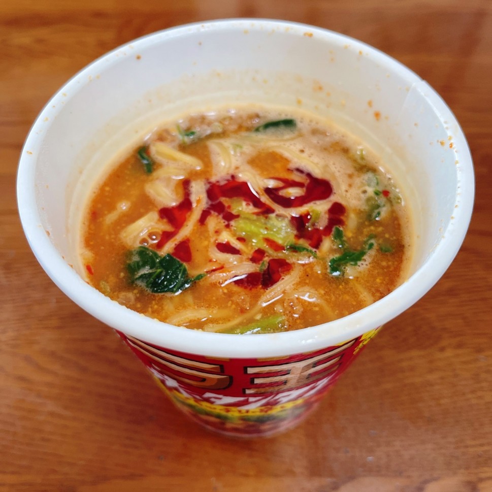 ランチは日清カップ麺のラ王赤タンタンです。バッチリ辛くて痺れも効いて、麺もプリプリで美味しい坦々麺でした。今まで食べたカップ麺の中でもダントツの旨さです!