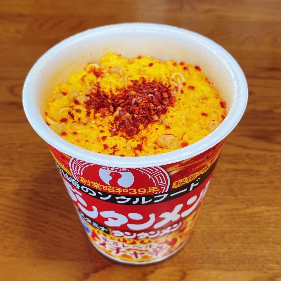 元祖ニュータンタンメン本舗のスタミナタンタンメン、今限定辛さレベルメチャ辛です。前回食べたスタミナタンタンメンにはなかった仕上げの小袋が付いていて刻み唐辛子がタップリ入っていました。