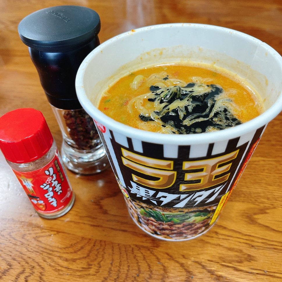 ランチは日清のラ王黒タンタンカップ麺です。花椒が練り込まれたプリプリの麺がうまい!山椒とジョロキア追加で美味しくいただきました!