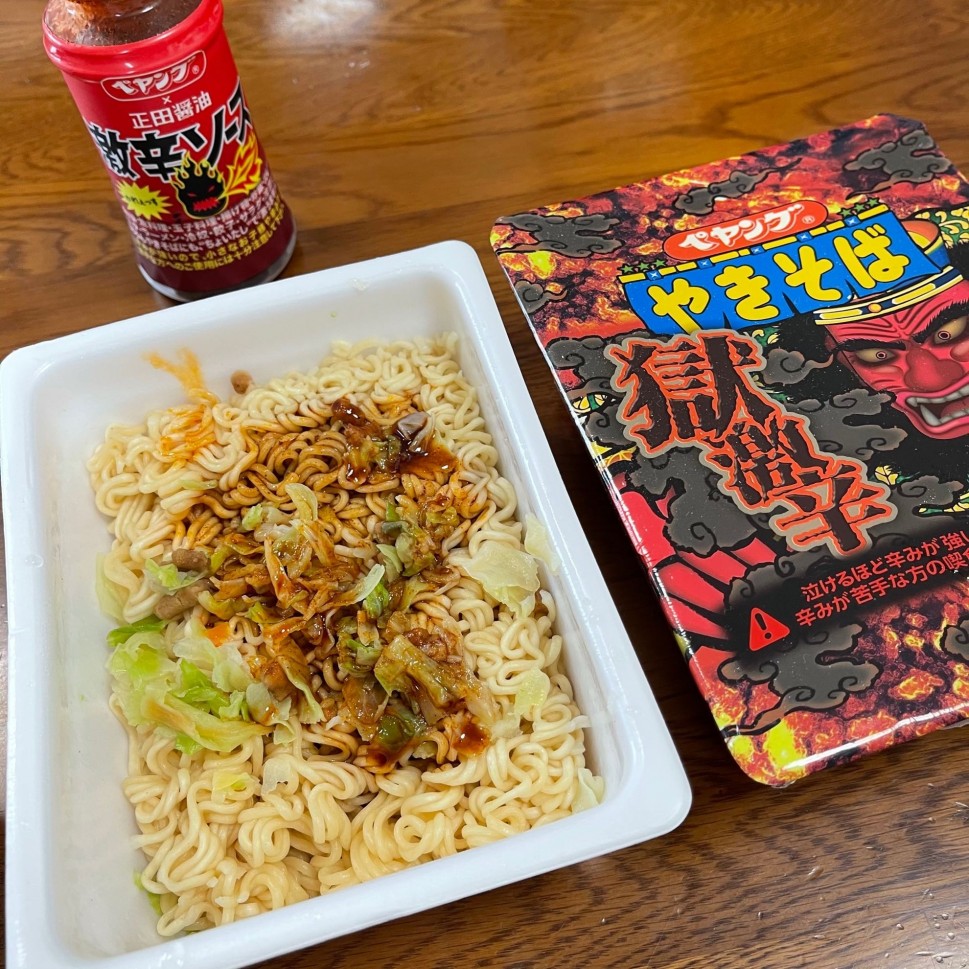 辛さを追加しようとペヤング激辛ソースをかけたら獄激辛ソースより甘いので辛味が和らいでしまって効果ありませんでした(T-T)