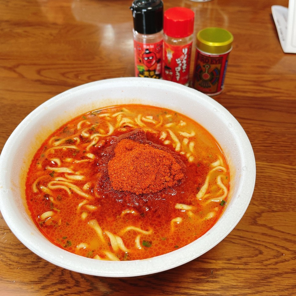 ランチは明星のカップ麺、らーめん専門店ぶぶかの鬼マシ豚骨醤油らーめんです。結構辛い!
