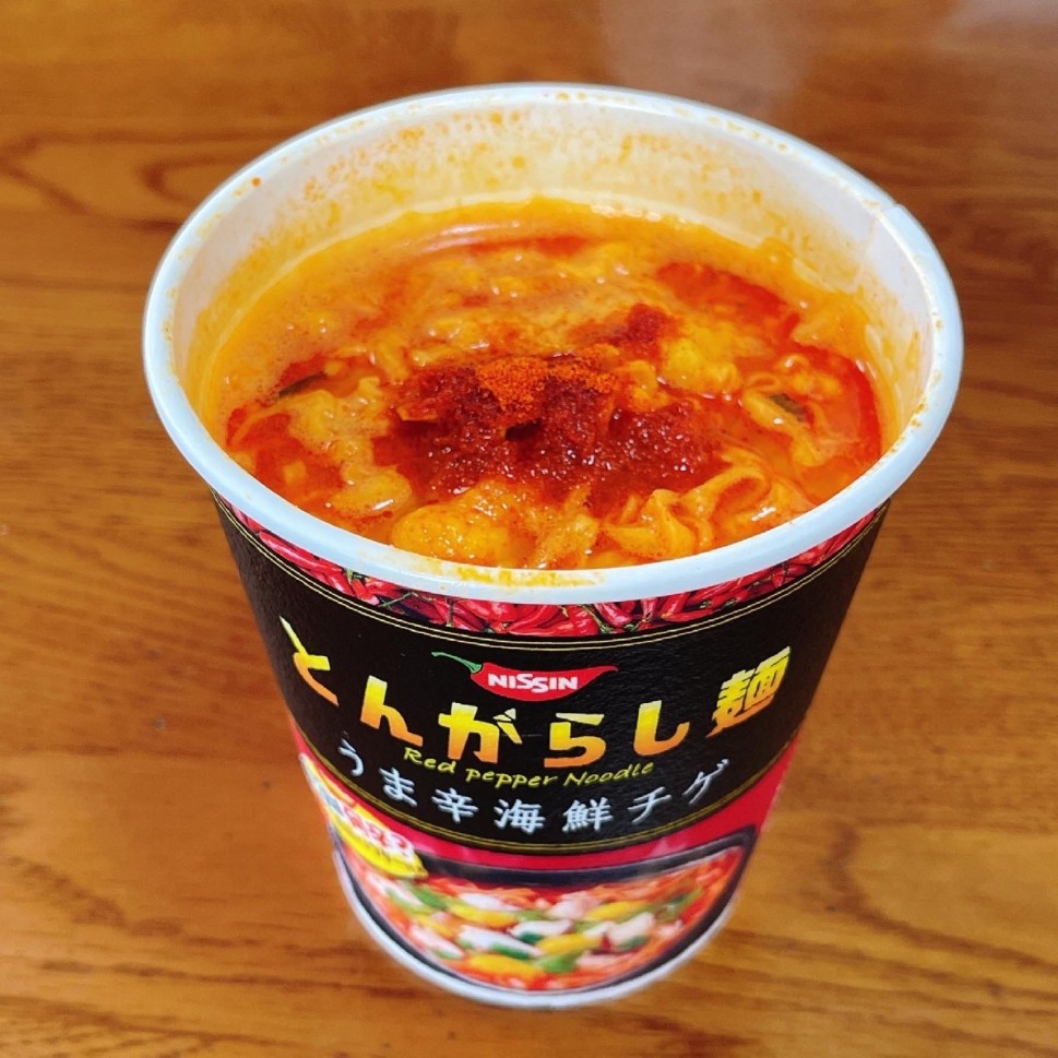 ランチは日清カップ麺のとんがらし麺うま辛海鮮チゲです。辛さ調整パウダーを全部投入して5辛、スコピル値950までアップするとなかなかの辛さ!唐辛子が練り込まれた麺はあまり辛くはなかったですが旨辛の海鮮チゲスープと一緒に美味しく頂きました!