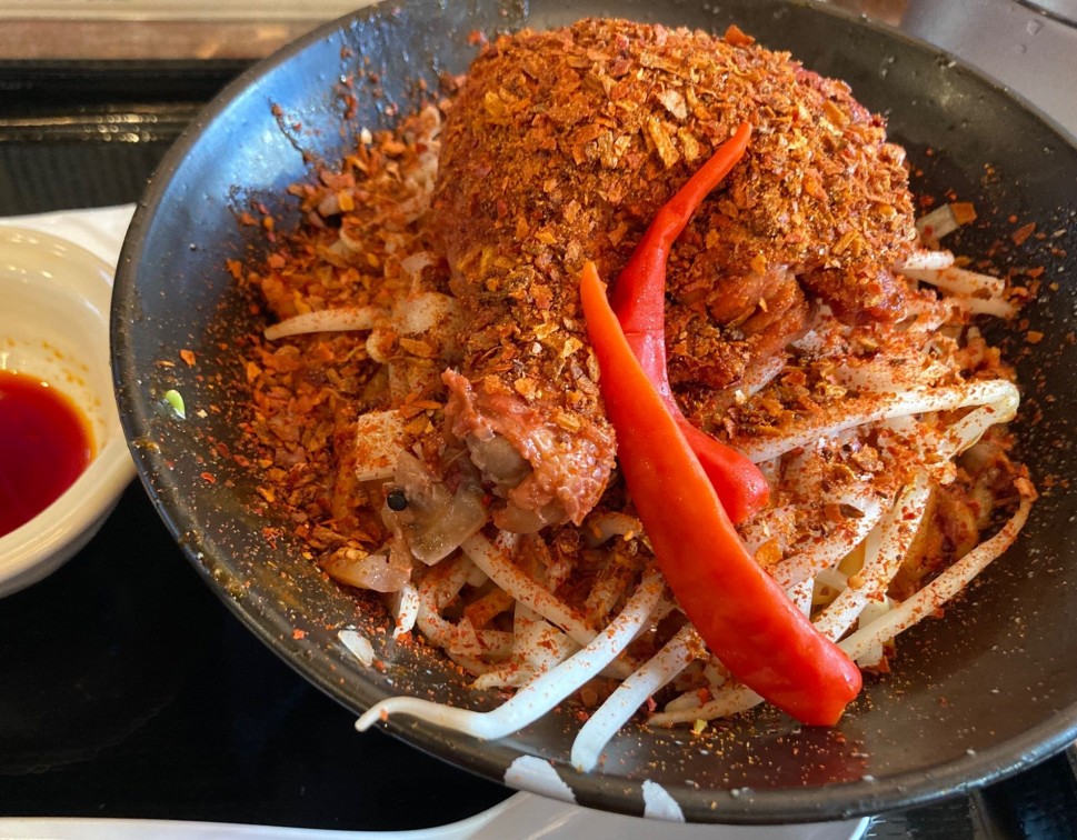 激辛オイルは20倍?の辛さなのでお気をつけください、とのこと。まずはかけずに戴くと、十分辛い。チキンも麺もはいくおりてぃな旨辛まぜそば。