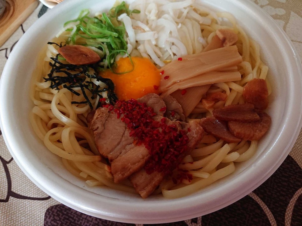 食べてみると、にんにくと卵と魚粉の風味がいい仕事をしておる。辛みもまあまああって、この底に沈んだドロドロのまぜ麺たれが太麺に絡み付いては離れない。まさに一蓮托生。