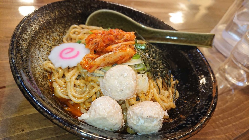 この辛油そばは、具材は特製の鶏だんご、キムチ、きざみ海苔、ネギ、なると、ごま。レギュラーの油そばと同じく、出汁は魚介ベース、何気にごまの風味が香ばしい。