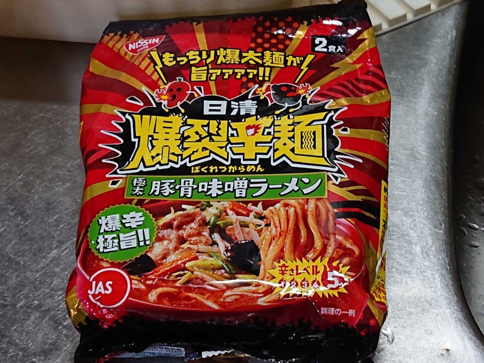 激辛レトルト食品在庫一掃プロジェクトはまだまだ続く、というわけで今回食べたものは、爆裂辛麺の豚骨味噌ラーメン。しかも2袋分作った。