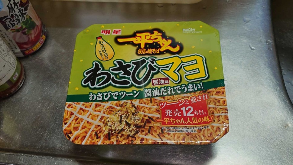 以前どこかのスーパーで買ったと思われるもの。先ほど寝起きで小腹が空いたのでこれを。スペックはわさびマヨビーム、醤油味の液体スープ、粉末わさびと刻みのりのふりかけ、乾燥キャベツが込まれた細麺。