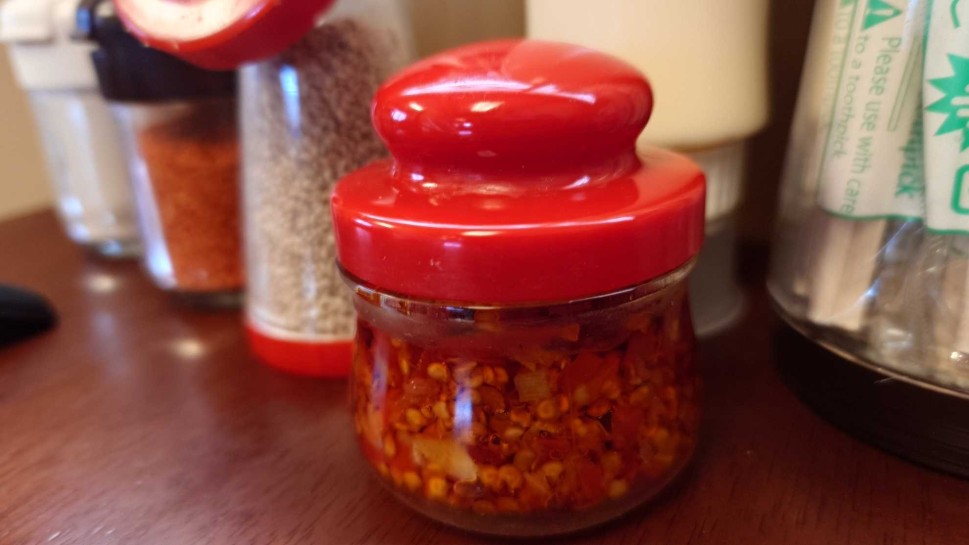 で、この「激辛南蛮」ですが、蓋を開けるとどこかで見たことのある斜め細切りの生唐辛子が。しかも油漬けというフォルムからすると、これは朝天辣椒なのかな? たぶん辣椒大王だと思う。