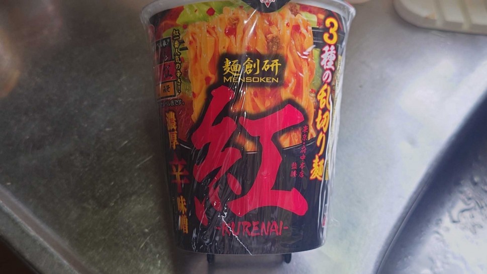 麺創研紅というお店のものを模したカップ麺というのは初で、どんなものかと紙ブタを開けると限りなくうどんに近い太麺で、具材はキャベツ、そぼろ肉、粗挽きの一味唐辛子。